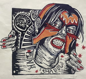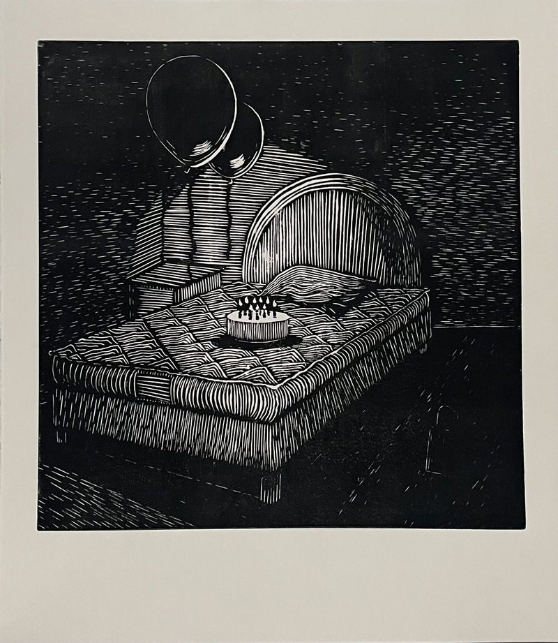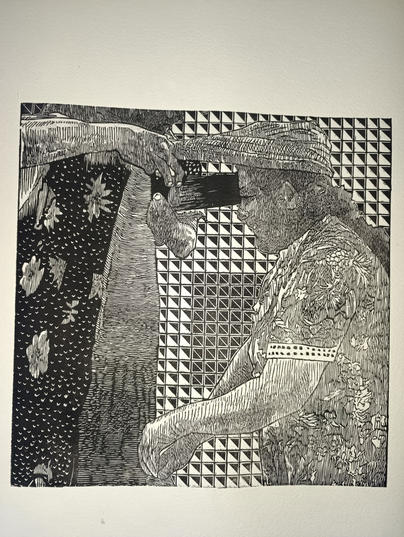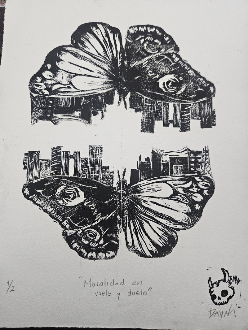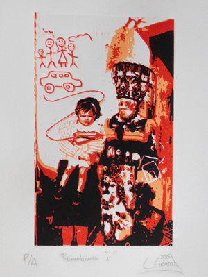 Temas; Identidad, memoria individual y colectiva. Mi grabado surge de una revisión a mi archivo fotográfico familiar. Explora los vínculos familiares y sociales que se generan a partir del carnaval y de la figura del chinelo como símbolo identitario de Yautepec, Morelos. Mi niñez transcurrió en el Estado de México, donde viví con mi madre y mi hermano, mientras mi padre residía en Yautepec, Morelos, por motivos laborales. Por ello, visitar Yautepec era poco frecuente, pero profundamente significativo. Llegar allí era entra en un alucín donde sentía la unión familiar y la creatividad. La imagen en la estampa es un retrato en el carnaval de Yautepec, del año de 1996, en donde mi madre me está cargando al lado de un familiar que se vestía de chinelo. El traje de chinelo representa, identidad aporta sentido de pertenencia, y aborda lo individual y lo colectivo. Esta obra relata una etapa muy importante en mi vida, en donde se forjaron recuerdos que actualmente le dan sentido a mi obra artística y a mi existencia. Y que me hacen reencontrarme cuando me siento perdido. En el aspecto formal; hago una apropiación de la imagen fotográfica y la intervengo con dibujos y garabatos que remiten a “lo infantil”. Me interesa enlazar el contraste entre lo descriptivo de la fotografía y la esencia lúdica que emana de los garabatos genuinos de un niño.