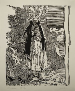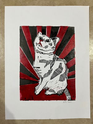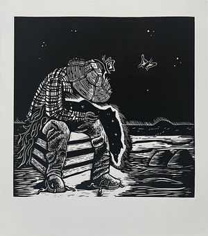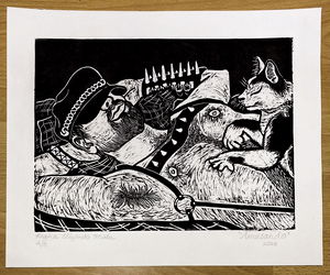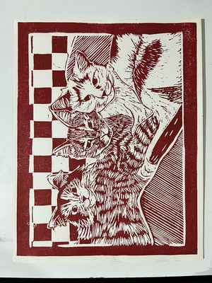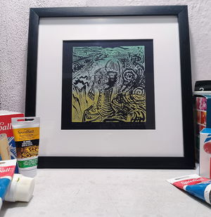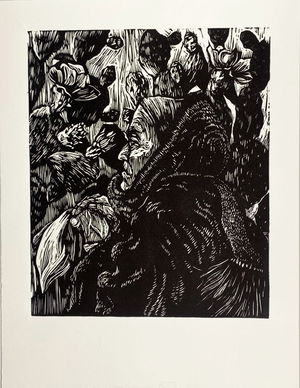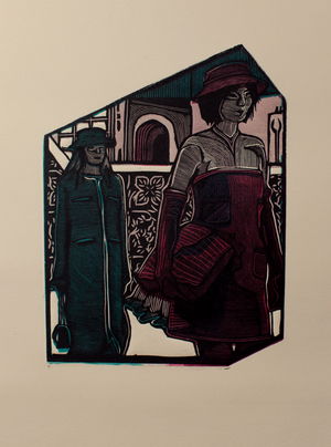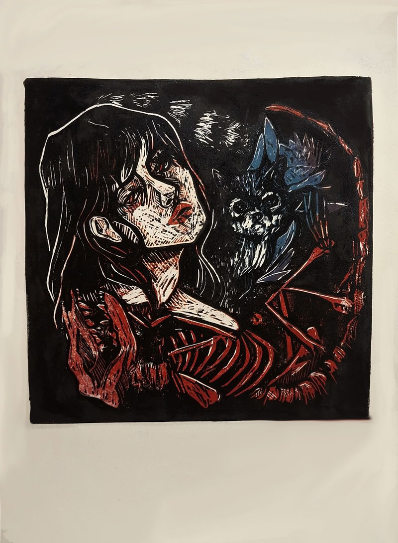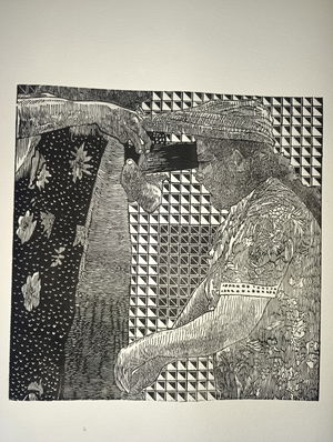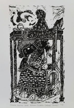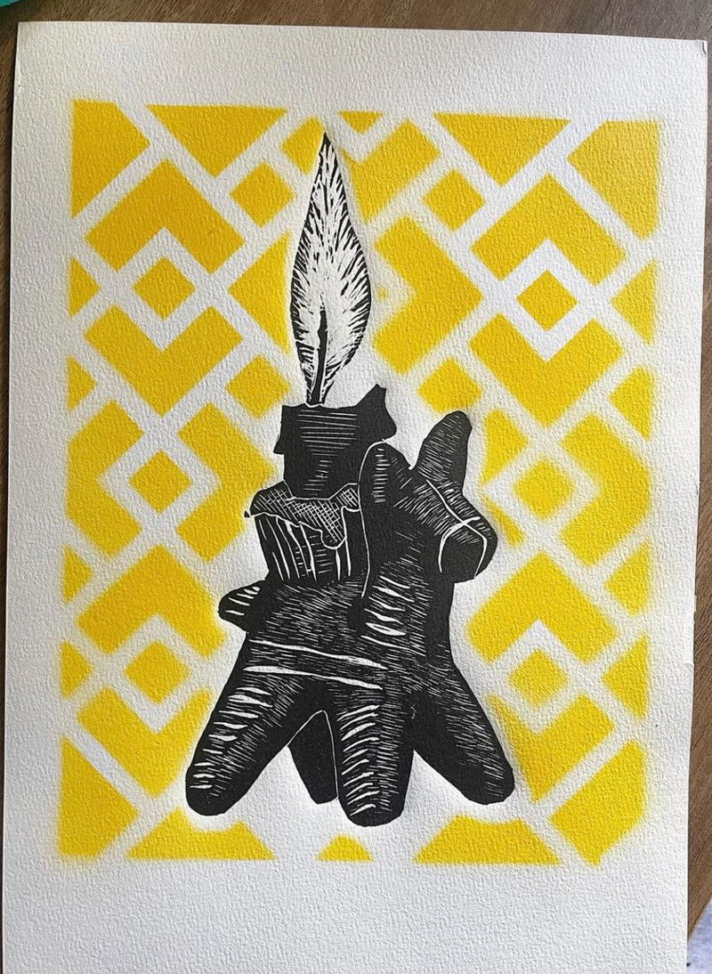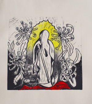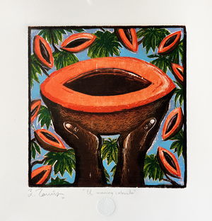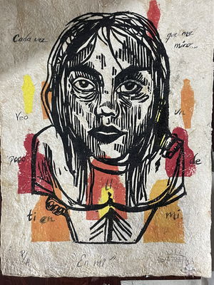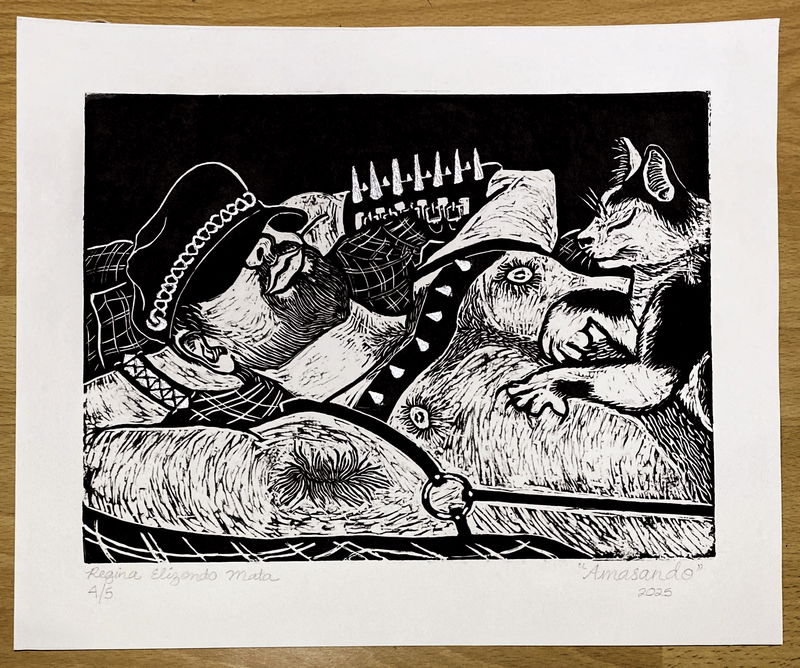 Grabado en linoleo de 30x30cm en papel de 40 x 50 cms La imagen representa 2 mujeres cocineras de la comunidad de San Mateo Yucutindo, en el estado de Oaxaca, en la cual podemos ver que una le ayuda a colocarse el reboso a la otra, esta obra es una alegoria al trabajo en equipo, a la sororidad y a las tradiciones de las comunidades originarias, en las cuales a tra vez del trabajo fisico, tranforman las materias primas en alimentos que nutren a las familias.