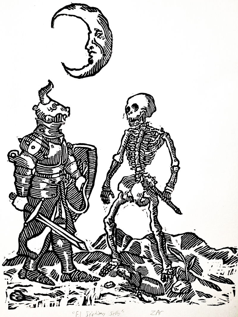 Grabado sobre trovicel. Dónde hago una alegoría a la muerte y como está inevitablemente llegará a nosotros, siempre tendrá la respuesta para acabar con nuestra vida. En este caso el caballero representando al Aleph (inicio) y que se asocia con el buey que simboliza la fuerza. A pesar de contar con esa fuerza la muerte siempre será inevitable. Tomando inspiración de la película llamada de la misma manera.