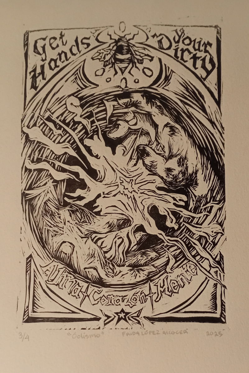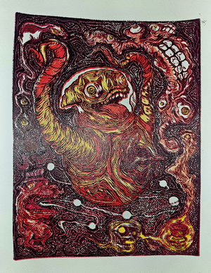 En la termodinámica, cuando hablamos de Entropía nos referimos a una magnitud que mide el grado de desorden o aleatoriedad de un sistema. La Segunda Ley de la Termodinámica nos dice que en un sistema aislado siempre habrá una tendencia de moverse del orden al caos, un ciclo enivitable que forma parte de la naturaleza del universo vivo mismo. Lo entrópico rodea, moldea, tranforma y vive... Lino Grabado a placa perdida y rompecabezas con 16 tintas. Impresión manual asistida con plancha de calor Pieza de papel texturizado de algodón de 300gr