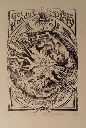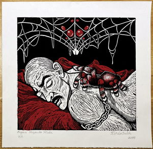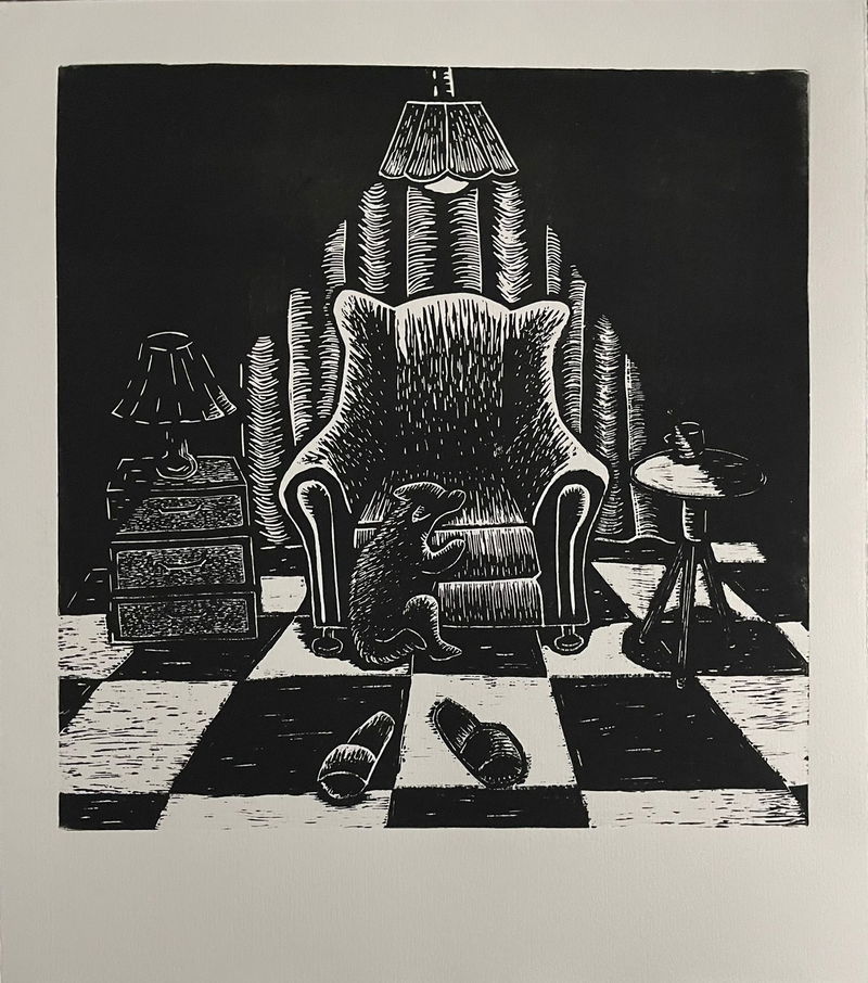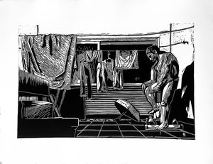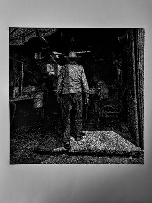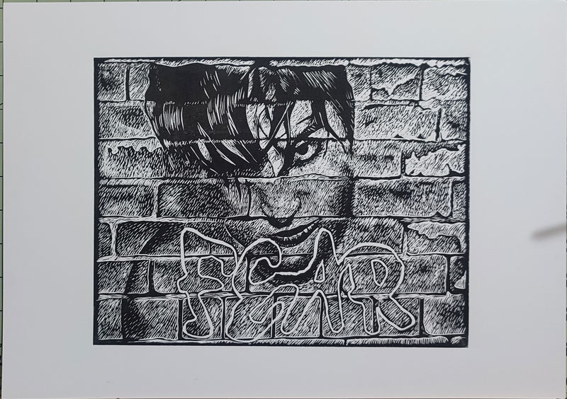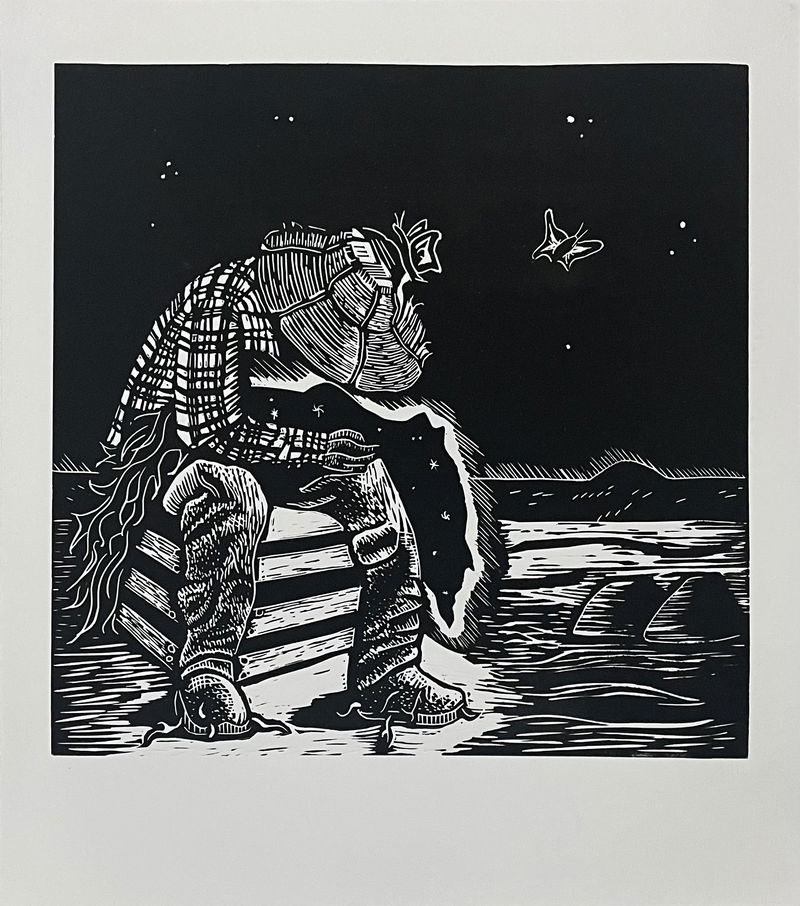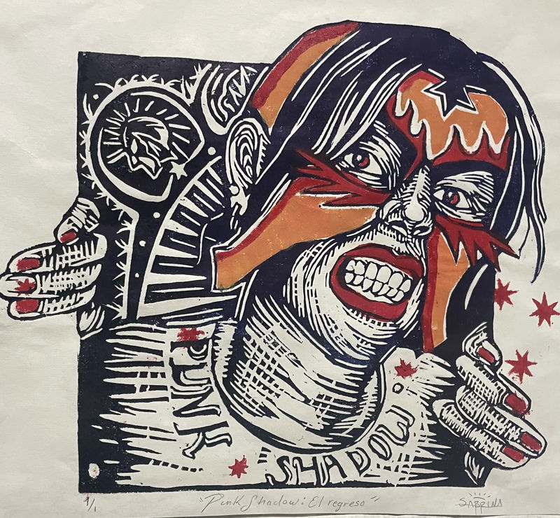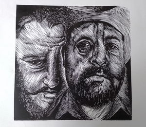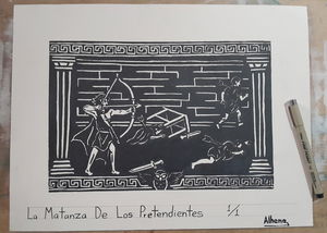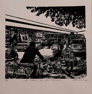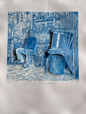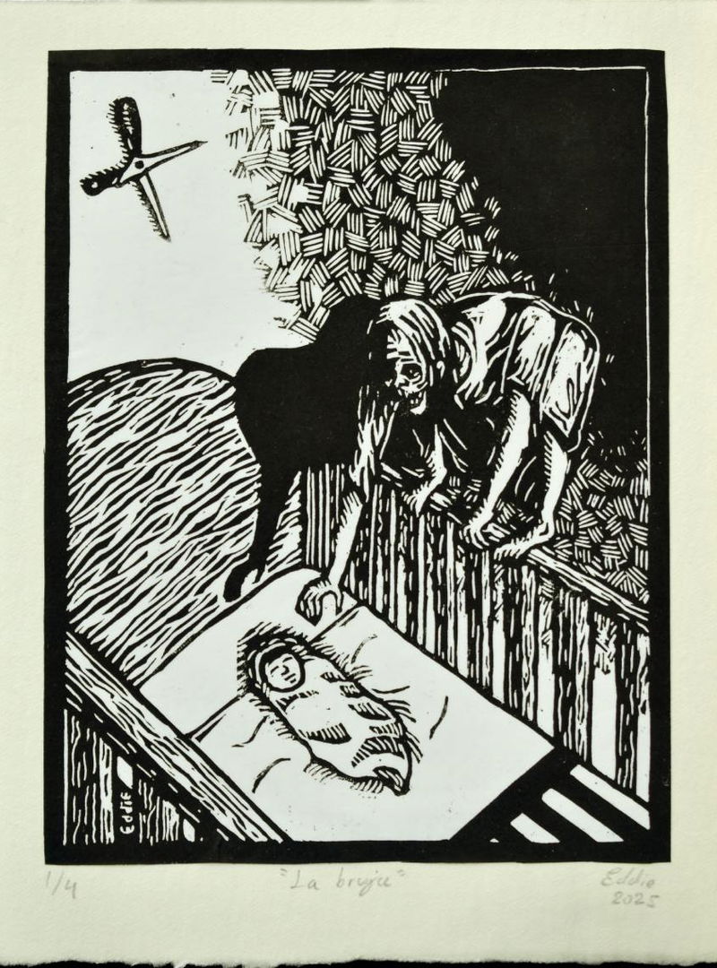 Es una alegoría del carpintero de mi barrio el cual ya falleció y también de todos estos grandes oficios que casi ya no hay, puesto que durante mi carrera de artes visuales, fue mi fabricante de lienzos y marcos la referencia es una de mis primeras fotos análogas de el en su taller, (trabajando en conjunto la gráfica y la fotografía) es un recordatorio de estos oficios en linóleo a manera de colage para una mejor profundidad visual.