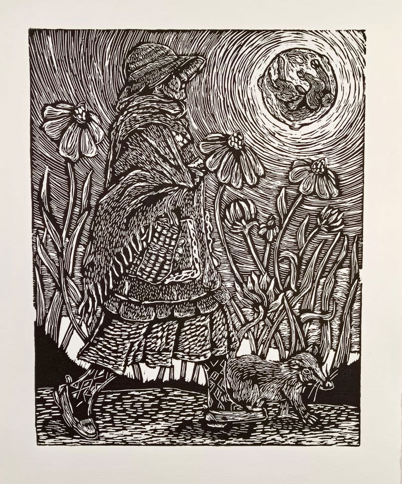 Este grabado no emana una historia, si no activa al observador a una lectura simbólica. Tratándose de una exploración sobre el caminar como un gesto ritual, el fuego como memoria viva, y la noche como un espacio fértil para la unión entre lo humano, lo animal, lo mítico, la memoria cultural y los procesos internos de trasformación. La simbología parte de nuestro personaje principal, una mujer que atraviesa la noche como territorio liminal, no es la evocación humana sino una entidad caminante entre mundos. La noche funciona como un umbral un espacio donde el tiempo se despliega y la racional se une con lo intuitivo , lo ancestral, lo no dicho. El tlacuache es un mediador introduciendo al el fuego a través de una sacrificio portando también la memoria encendida, como conocimiento que trasmite con dolor, con herida trasformadora. La luna este símbolo no se impone, se revela. Esta ahí para el que sabe mirar, siendo una metáfora del sacrificio que dejó huella, del acto generoso que trasciende el instante. Su integración sugiere que las acciones invisibles también tienen poder, que los gestos pequeños constituyen historias.
