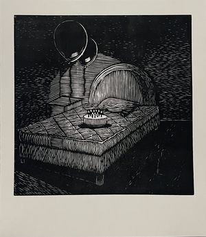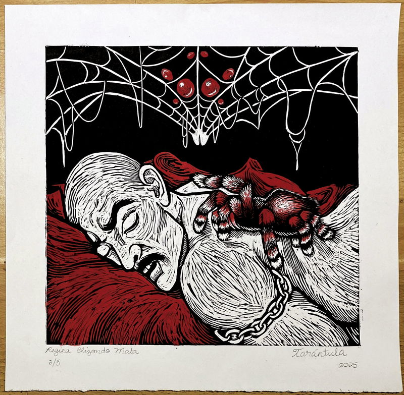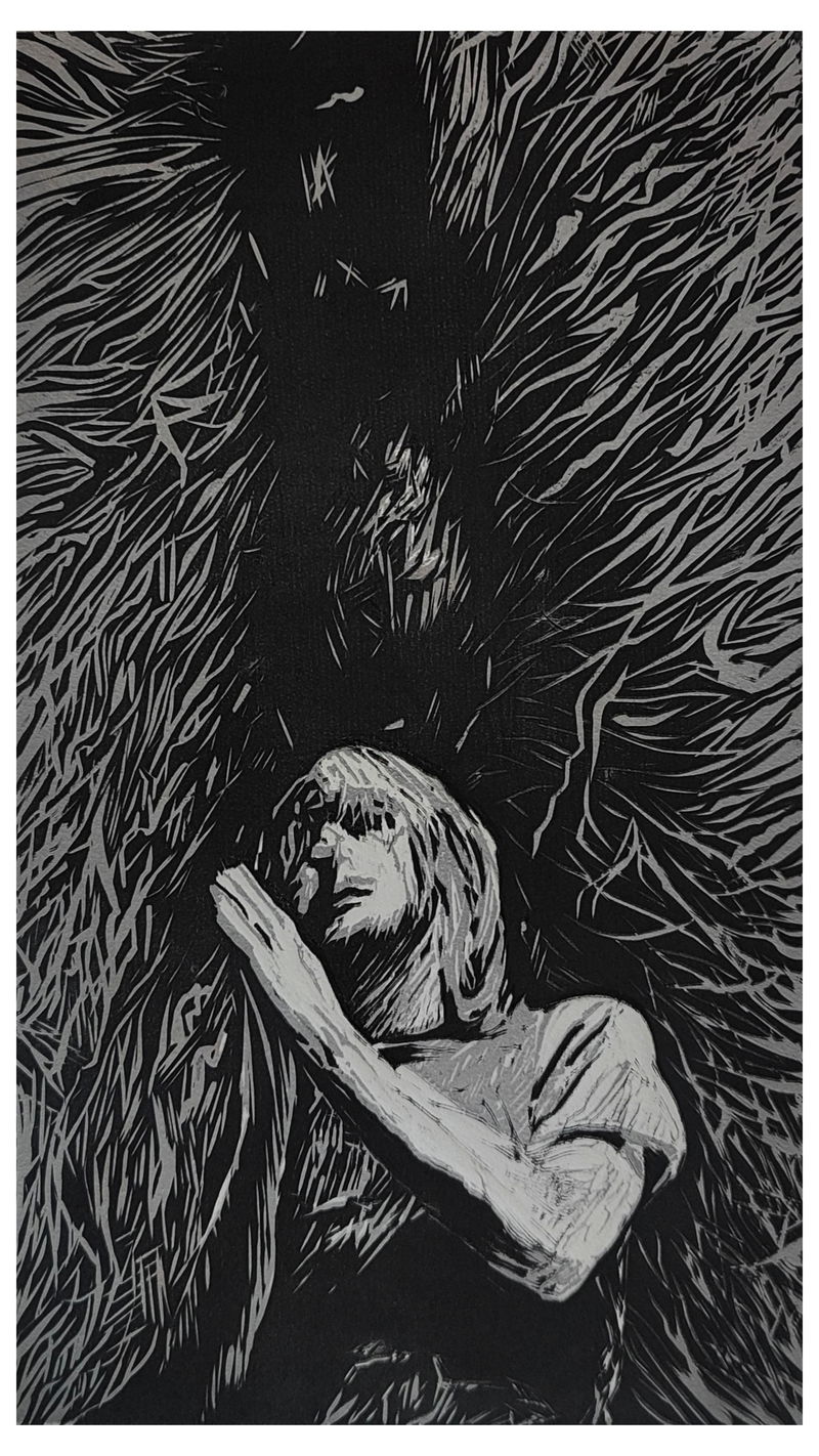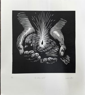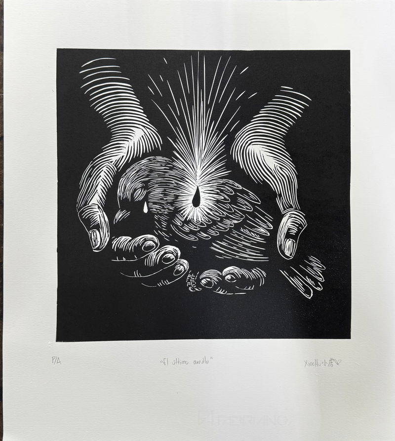 Impresión final Con la matriz terminada, llevé a cabo la impresión definitiva sobre papel de algodón Fabriano. En ese instante, la tinta y la textura se unieron para dar forma a: "El último arrullo", una obra que honra la vida de mi Teresita, mi abuela. Fue como escuchar, a través del papel su voz y sentir sus abrazos que me siguen cuidando a donde quiera que vaya.