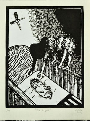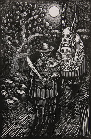 La figura de la bruja es una adaptación de las creencias traídas de Europa haciendo sincretismo con el pensamiento de los pueblos originarios, tiene presencia en los relatos de zonas rurales y algunas urbanas de México como un dejo del imaginario construído durante el proceso de colonización. Los relatos sobre brujas que depredan a los infantes siguen contándose y traen consigo la posibilidad de dar una explicación poco convencional a situaciones funestas. Esta pieza representa el momento en que una entidad maligna está a punto de atacar anulando la eficacia del amuleto de las tijeras a manera de cruz. Maldad e inocencia con un final cruento, el temor por la seguridad del porvenir.