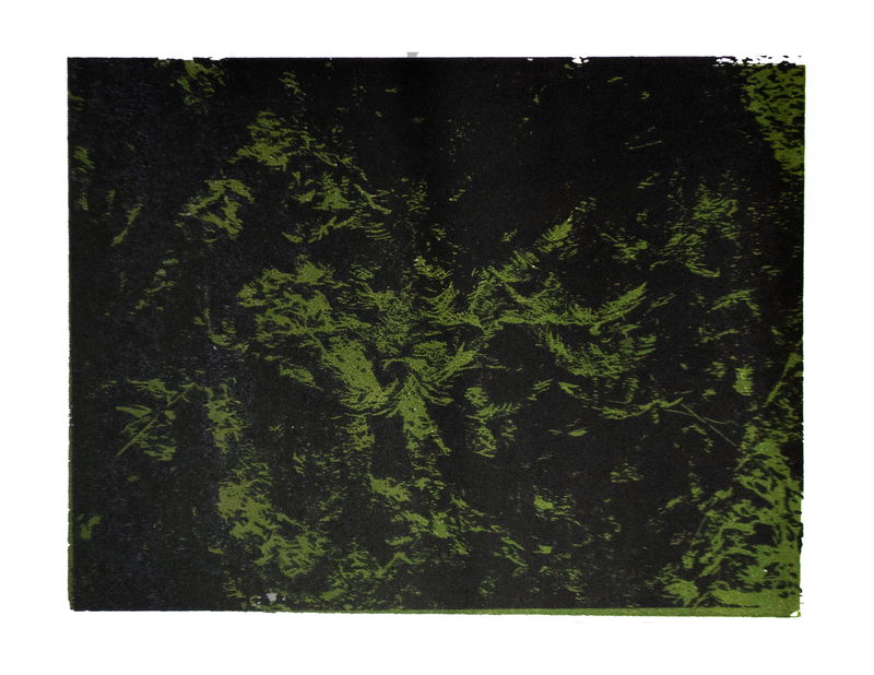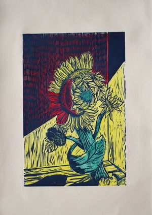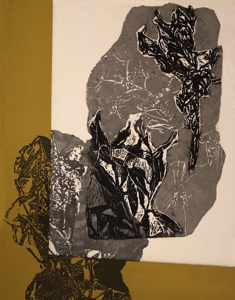 Tras el desastre nuclear de Chernóbil, los girasoles fueron empleados en procesos de fitorremediación para absorber metales pesados y toxinas del suelo contaminado. Estas plantas, al incorporar en su cuerpo los residuos de un ambiente envenenado, sobrevivieron, pero su vitalidad quedó marcada por la mutación y la alteración irreversible de su forma. En esta estampa, el girasol mutado funciona como metáfora del cuerpo atravesado por un trauma extremo. Al igual que la planta que absorbe la toxicidad de su entorno, el cuerpo humano asimila en su interior el venenos de la experiencia traumática y violenta. No se trata de una vida que retorna a la normalidad, sino de una existencia transformada, de un dolor que se mantiene en el cuerpo y se vive con él. Es una existencia quebrada, que se sostiene del vacío y se sobrevive con una herida persistente.