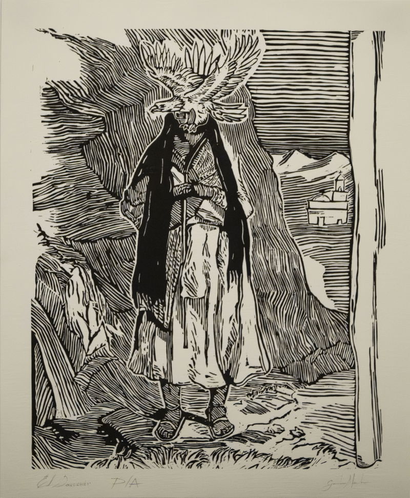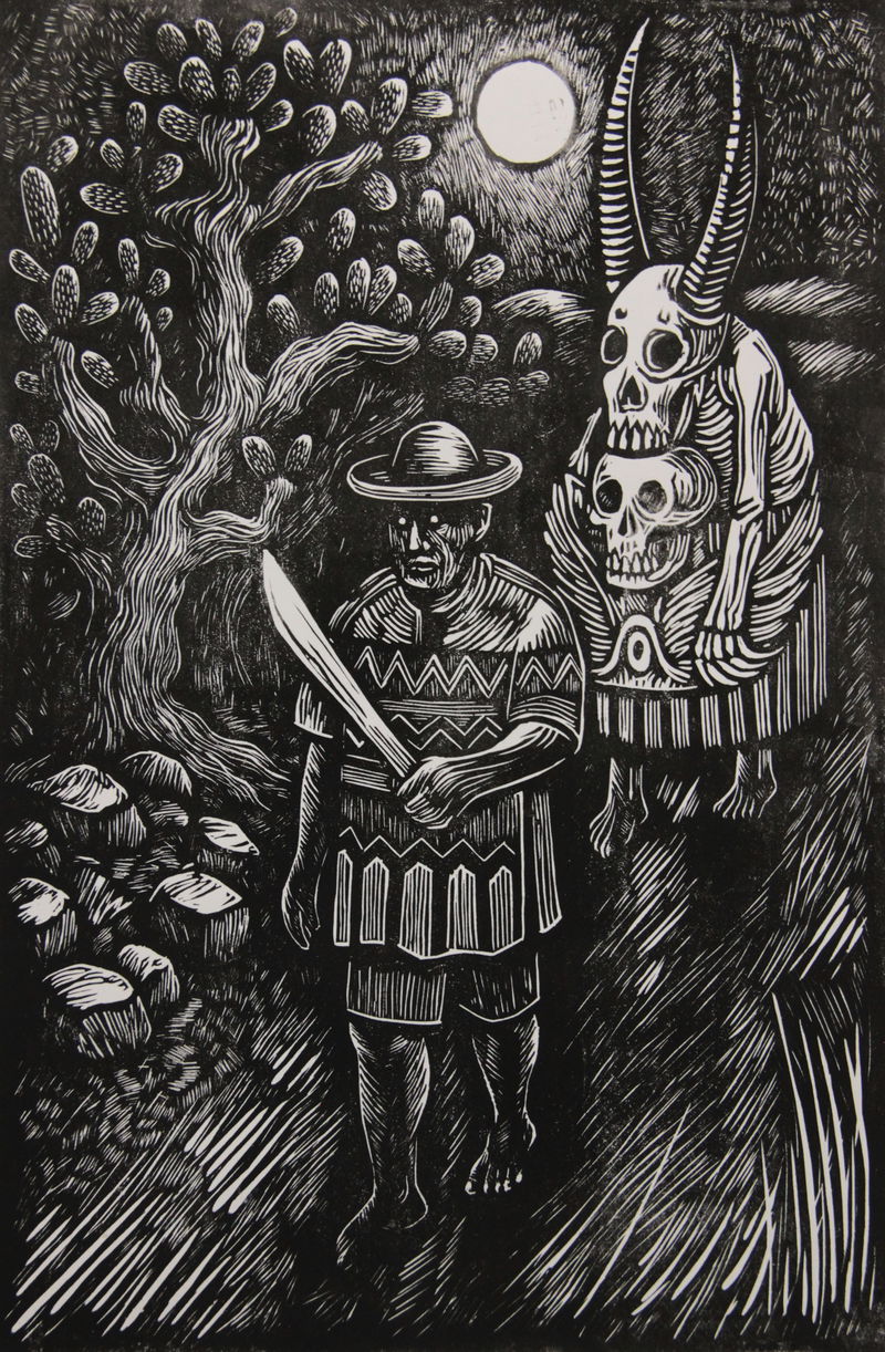 El grabado hace referencia a lugares rurales, especialmente del pueblo que se relaciona con el personaje principal, quien representa a este familiar que me causa sentimientos, este sentir. Sin duda es la silueta de mi abuelo. Este grabado está acompañado de los arrepentimientos de no tener más recuerdos, más tiempo con nuestros seres queridos. No lloré cuando te vi abajo. A veces me pregunto por qué, y creo que era muy pequeño para entender que no te vería de nuevo. Me hubiera gustado conocerte más, quizás el tiempo suficiente para ser consciente de que nada dura para siempre. Abuelo, sé que eras un gran hombre; nadie habla mal de ti aunque ya no estés. Y si bien ya no recuerdo bien tu voz ni las pláticas contigo, sigo admirando todo lo que lograste.