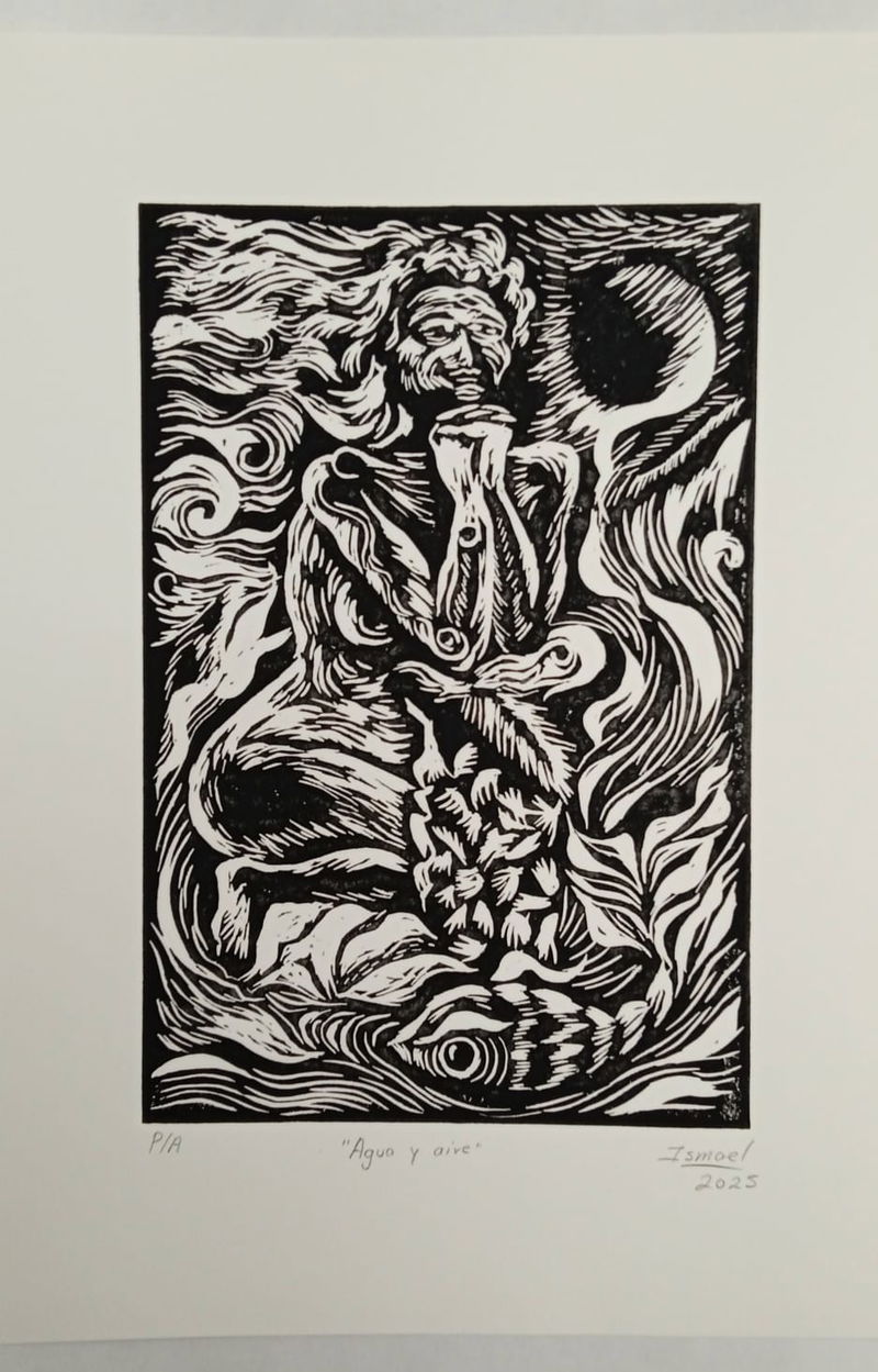 En este grabado títulado "Aire y agua " represento a estos elementos vitales para el ser humano, el agua, el viento, que junto con la figura femenina dialogan en un conjunción, creando una unidad mediante las líneas curvas y onduladas que generan movimiento con las plantas, el pescado y la luna.