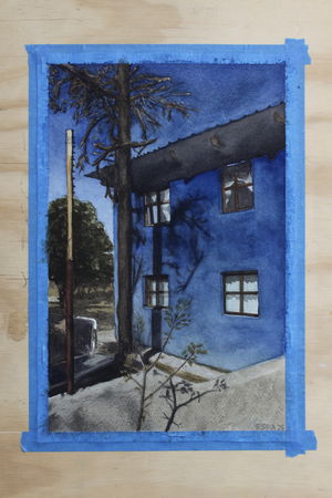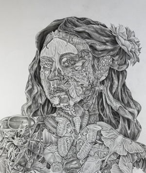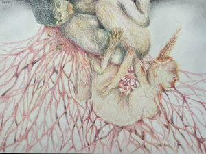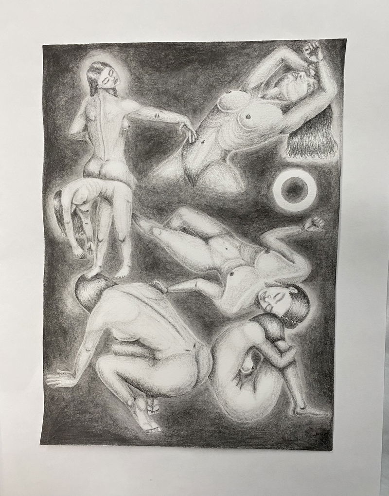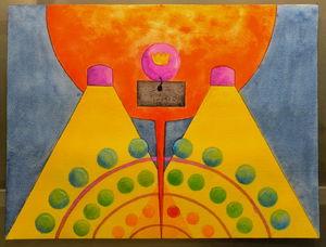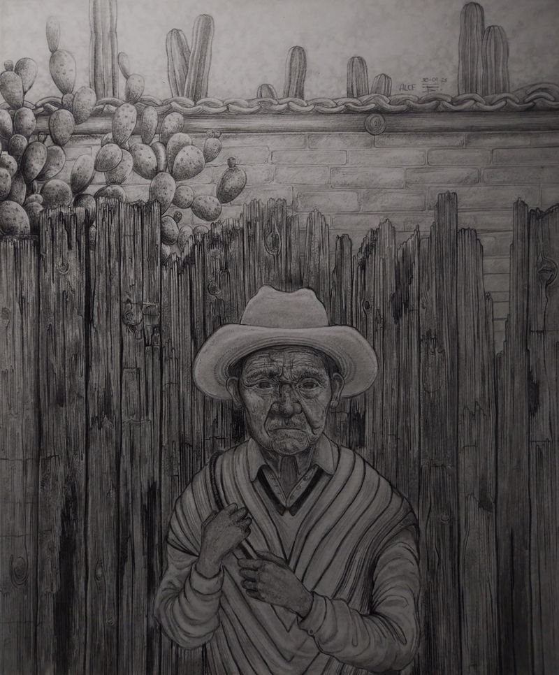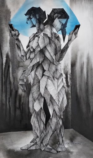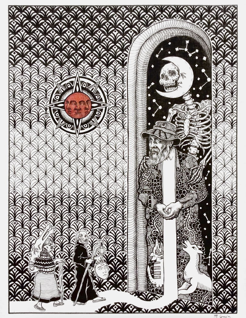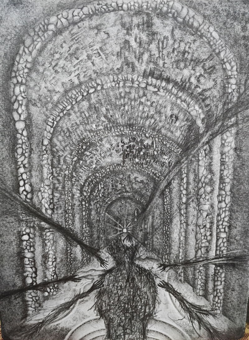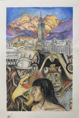 Umbral sagrado parte de un proceso de dibujo etnográfico, en el cual registro a los personajes que cohabitan la cultura, presentándose, no solo como entes activos de la sociedad sino también mostrando el arquetipo que encarnan y los conecta con nuestra cosmogonía. En la escena se recorre un espacio etéreo, donde la conciencia rige y observa toda la existencia, el sol de 3 rostros es quien juzga y orienta en el paisaje onírico, este espacio lo recorren 2 personas, las cuales cargan sus máscaras hacia el umbral, a modo de tributo o sacrificio las ofrecen al guardián del pórtico para trascender, esta identidad proyectada en la máscara de la que tendrán que despojarse para acceder a un estadio distinto. El guardián que es a la vez el umbral esta inmerso en una ambivalencia con la muerte, la muerte como el umbral final, la cual se tendrá que aceptar para poder acceder a un conocimiento sagrado del cosmos. Esta imagen vincula una estética cotidiana, como lo son personas que habitan la cultura contemporánea con mitologías y conceptos inherentes en la alquimia y diversas religiones a través de los códigos visuales del dibujo de realidad Fantástica.