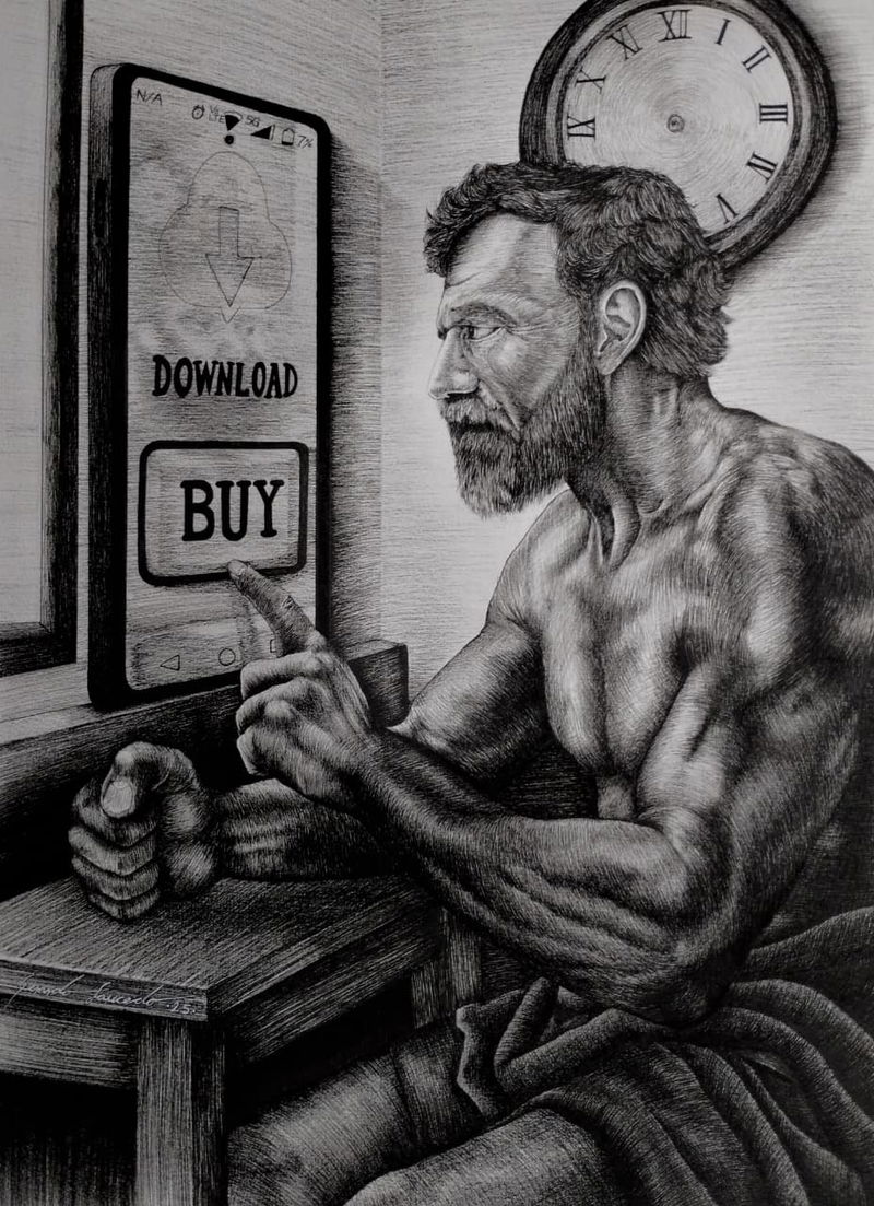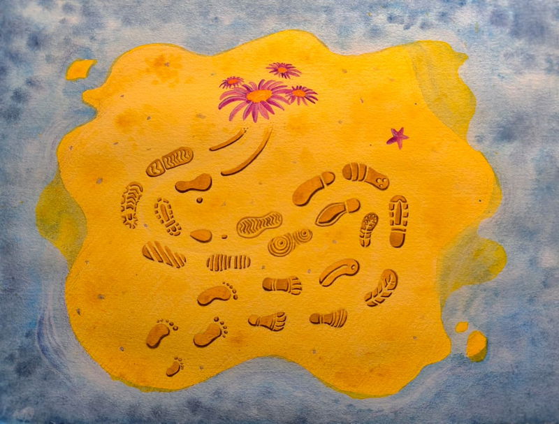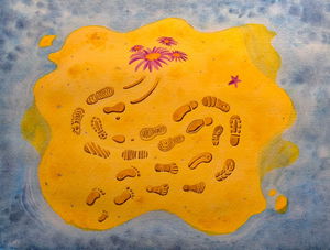 Todos llegamos a este mundo descalzos y en este estado son pocos los primeros pasos que damos. Pronto somos armados con un par de envolturas para andar, y portar suelas de caucho se vuelve una necesidad impuesta y estandarizada para poder vivir dentro de una sociedad moderna y evitar el juicio ajeno. Sin embargo, enseguida nos apropiamos de esa idea, creyendo que nosotros somos los zapatos mismos. Cegados por una marcada cultura del consumo, la apariencia y el reemplazo instantáneo, se nos va la vida cambiando muy seguido de "anclas de suelo". Al final del tramo de esta línea llamada "vida" solo nos queda un par de zapatos viejos y un tercer pie, mejor conocido como "bastón". Un paso más allá, somos una silla de ruedas con un bulto abarrotado de 70 kilogramos encima de ella. Finalmente, la arena hace lo suyo; absorbe lo que alguna vez le perteneció. En qué momento perdimos tanta libertad (no solo hablando en términos de zapatos), la repercusión más obvia para todo esto es cada vez más evidente: nos es extremadamente difícil definir quiénes somos y morimos sin siquiera habernos conocido a nosotros mismos. Así de lento, así de fugaz... Así de triste.