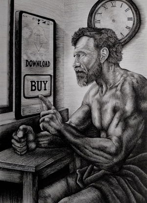 Un par de amantes, fusionados, un solo ser; unidos en cuerpo, separados por la tecnología, hablando entre sí, mediante dispositivos tecnológicos. Una escena que comúnmente se replica en la sociedad actual, una situación que no es exclusiva de las relaciones de pareja. Mensajes que salen de la tierra y regresan, recorriendo distancias enormes para comunicar a personas que están a centímetros de distancia física. El amor y las relaciones del futuro nos han alcanzado, cavando un surco generacional que no parece apuntar a algo deseable, dando pie a una sociedad donde el individualismo es el estandarte.