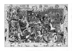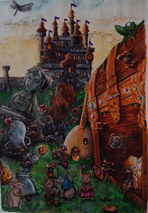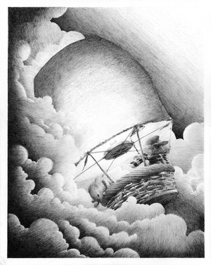 Un viejo ratón deseoso de explorar y conocer un mundo que él sabe es infinitamente más grande que él mismo se ha armado de valor para emprender su viaje después de encontrar una canasta de mimbre en perfecto estado y después de haber hecho modificaciones a su sistema de descenso. Con él viaja su sobrino: un niño que perdió a sus padres desde muy pequeño y quedó a cargo de su tío, del cual, a través de sus historias y de sus búsquedas, ha encontrado un ansia inmensa de grandes aventuras. Aquí encontramos a nuestros protagonistas saliendo de entre las nubes y escapando por poco de una posible tormenta. El uno viendo casi con nostalgia cómo el cielo al fin se abre frente a ellos y el otro viendo incrédulo el mundo que están dejando atrás. Un dibujo hecho completamente con tinta china, estilógrafos del 003, 005, 03 y 04 (Sólo la flama de la vela y parte de la bufanda del viejo ratón se hicieron con tinta aguada, pero aún tinta china), y fue primero el dibujo que la historia. Las nubes los rodean y le abren el paso con trazos finos direccionales a un globo que ellos construyeron con papel y alambre y le amarraron una canasta de mimbre con agujetas viejas, además de añadirle una cuchara azucarera como sistema de descenso (Aún por probar) para reducir el calor que llegue de la flama al globo. Una vez que la escena cobró vida, los personajes dieron pistas de quiénes eran y es de ahí que nace el relato.