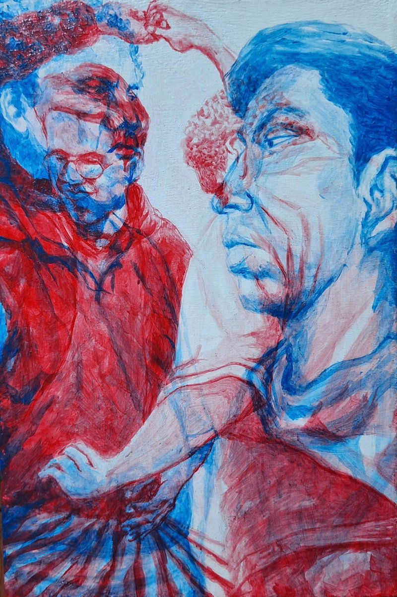 "Latencia" explora la fragilidad de la percepción. A través de la distorción de los rostros, la obra construye un espacio donde lo real y lo onírico coexisten sin limites definidos. El rostro principal, descompuesto en planos, sugiere una presencia que existe entre múltiples versiones de sí misma, mientras que las figuras secundarias funcionan como desdoblamientos de una misma experiencia. La composición representa ese estado de latencia como un instante previo al reconocimiento, donde la mente oscila entre experimentar la realidad o perderse en percepciones alteradas. La pintura propone una reflexión sobre la delgada línea que separa la experiencia tangible de los territorios inciertos de la mente.