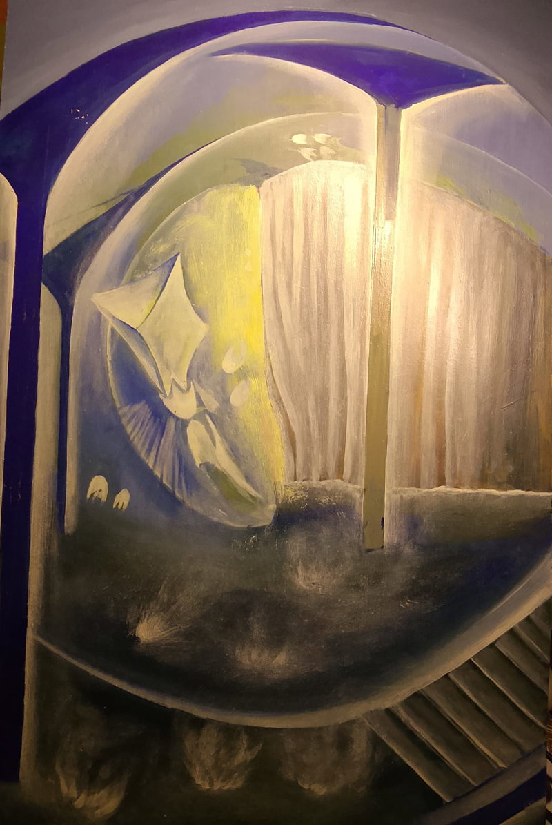 En esta imagen podemos apreciar la obra en su mayor esplendor, los elementos que están presentes no fueron elegidos al azar, detrás de todo hay un por qué. Esta pieza representa el momento exacto entre el mundo que nosotros consideramos real y el mundo de los sueños; el mundo de la fantasia desde mi perspectiva, explorando la duda fundamental sobre qué es lo que define nuestra realidad. El tema se aborda no como una dualidad separada, sino como un umbral en tension, la frontera donde la conciencia (representada por la estrella) intenta alzar la cortina que nos mantiene en la inercia del día a día (los sueños o las percepciones falsas).